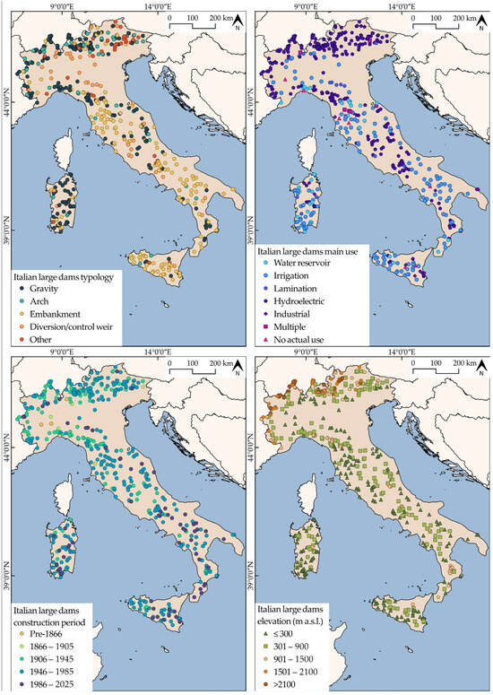 Figure 1. A multi-panel figure illustrating the 530 large Italian dams [74] classified and geolocated within a GIS software (3.40.11). These dams are categorized based on construction type (top left), main use (top right), construction period without further temporal specifications regarding maintenance/expansions (bottom left), and their elevation location (bottom right).