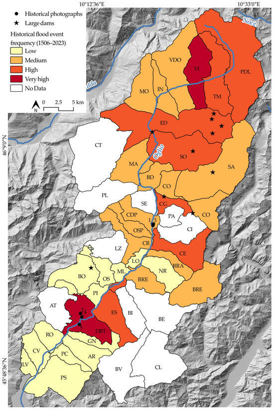 Table 5. Flood events and relative frequency occurrences (period: 1506–2023) affecting the municipalities of Valcamonica [91,92,93,94,95,96].