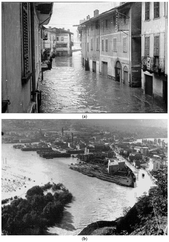 Figure 4. Historical images of Valcamonica area, respectively (a) Capo di Ponte and (b) Darfo Boario Terme, affected by the 1960 flood. For their location, refer to Figure 3. The historical flooded areas were used as a reference for the improving of dam break scenarios, in addition to other data [92].