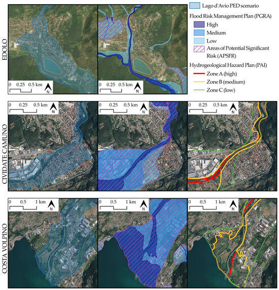 Figure 5. Three areas in Valcamonica (Edolo, Cividate Camuno, and Costa Volpino, respectively, ED, CC, CV in Figure 3) where differences in the application of current planning instruments (PED, PGRA, and PAI) [100,101] are evident.