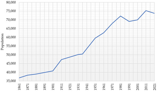 Figure 6. Trend of the resident population in Valcamonica (period 1861–2021) [83,84].