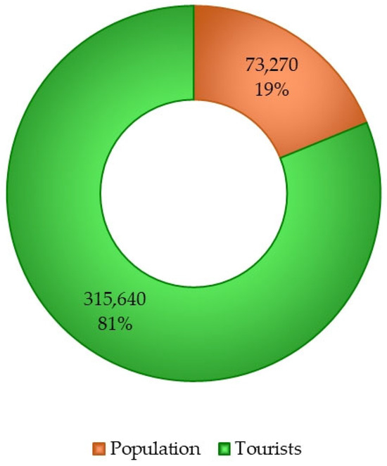 Figure 7. Resident population and tourist presence according to the most recent available data, for the year 2023 [83,85].