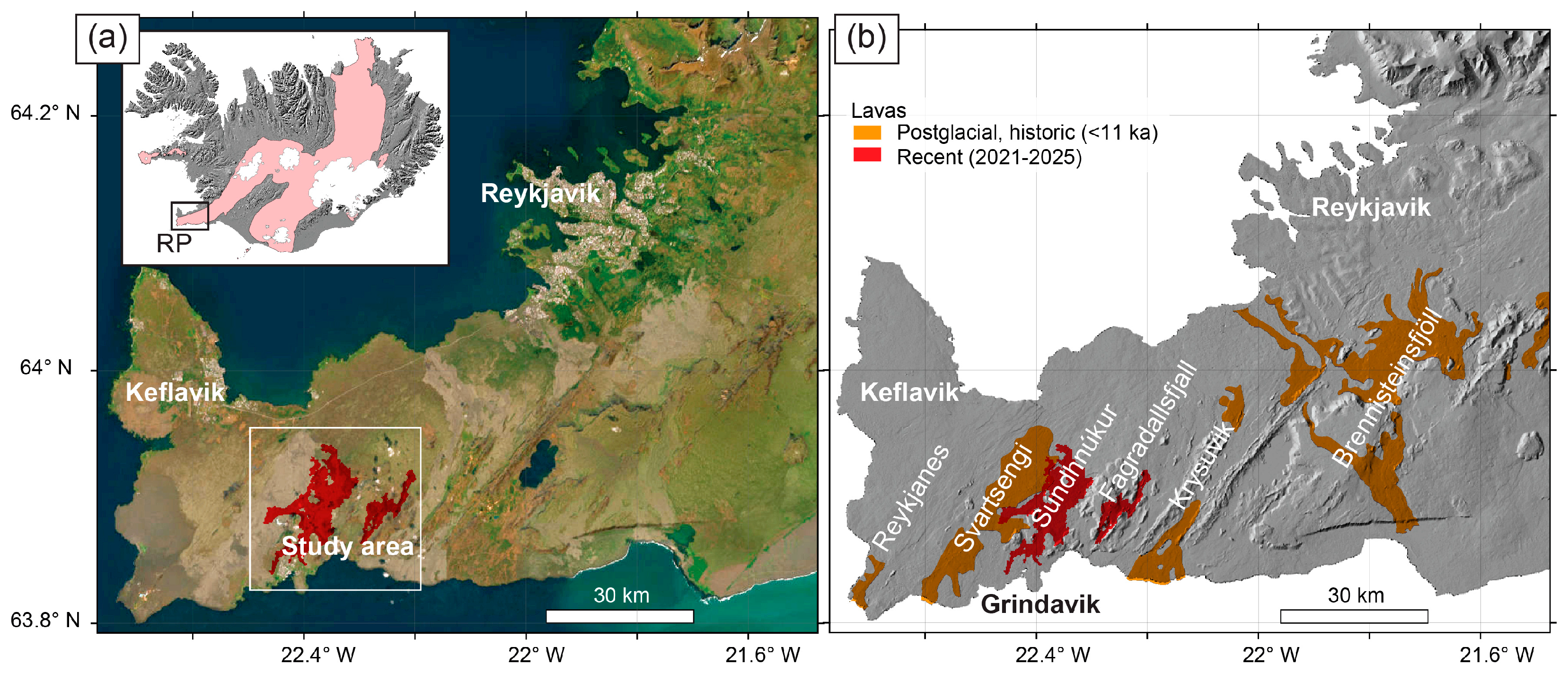 - Troll, V.R.; Deegan, F.M.; Thordarson, T.; Tryggvason, A.; Krmíček, L.; Moreland, W.M.; Lund, B.; Bindeman, I.N.; Höskuldsson, Á.; Day, J.M.D. The Fagradalsfjall and Sundhnúkur fires of 2021–2024: A single magma reservoir under the Reykjanes Peninsula, Iceland? Terra Nova 2024, 36, 447–456. [Google Scholar] [CrossRef]