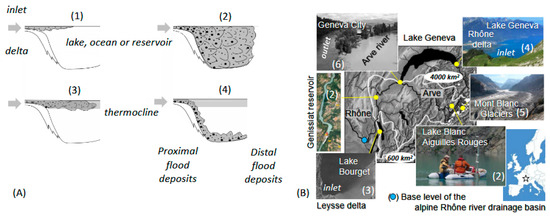 Drawings (A) and pictures (B) illustrating the types of flows occurring during a flood event, based on the density difference between the tributary and the receiving basin: hypopycnal (1), homopycnal (2), mesopycnal (3), and hyperpycnal (4). Illustrations in (B) from the western Alps (white star) drainage basin of the Alpine Rhone River (Switzerland/France) show how sediments eroded by glaciers (5) can be transported by fine-grained suspended sediment load in fluvioglacial streams (6), resulting in homopycnal flows (2) and turbid waters in mountain lakes and reservoirs, mesopycnal (3) or hyperpycnal flows (4), and associated sediment plumes in the downstream lacustrine deltas. In mountain ranges, snowmelt and heavy rainfall can also cause erosive flash floods and large sediment plumes (2, 3, 4, and 6) in lakes. The alpine base level of the Rhone River in the southern Jura anticline is indicated by a blue circle. The IGN aerial photograph of a sediment plume in Lake Bourget, originating from the Leysse delta and illustrated in (B), is located in the southern part of the lake. The IGN aerial photograph of the Genissiat reservoir is from Geoportal (URL www.geoportail.gouv.fr, accessed on 11 February 2025).