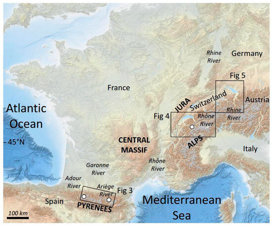 Quaternary glaciations in mountain ranges resulted in the formation of numerous small glacial lakes at variable altitudes [7,11,12,13,14,15,16,17,18] and large glacial valleys now characterized worldwide by deep lakes, fjords, or thick Quaternary deposits of glacial, lacustrine, or fluvial origin [9,19,20,21,22,23,24,25,26,27,28,29,30]. In western Europe, Holocene climate change in the Jura mountains and the Alps (Figure 2) impacted erosion rates and favored sediment waves in alpine drainage basins, modulating river geomorphology (e.g., progressive downstream development of braided river patterns) and piedmont lake sedimentation (higher lake levels; more frequent and thicker flood deposits) during wetter periods characterized by strong westerlies over the Atlantic Ocean [31,32,33,34,35].