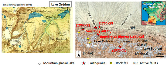 Location of Pyrenean mountain lakes Orédon and Fourcat within the Garonne and Ariège Rivers’ drainage basins. The North Pyrenean Fault (NPF) and other active faults (dotted lines), together with the years of historical earthquakes and their likely epicenters (red stars) and large rockfalls (yellow circles), are indicated according to [49]. The extension of the 21 June 1660 CE Bagnère-de-Bigorre earthquake intensity is also illustrated in roman numbers (right panel) were red area (intensity VII), orange area (intensity VI), yellow area (intensity V) and green area (intensity IV) are indicated. As shown on the old topographic map (left panel), Lake Orédon drained several glaciers and glacial lakes during the Little Ice Age. These natural lakes were later flooded by hydroelectric dams, as detailed in the text.
