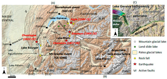 Geological setting of the western Alpine glacial lakes and main cities (square black boxes) within the Rhone River drainage basin (A). Location of Lake Blanc in the Aiguilles Rouges Massif (B). Quaternary sediment infill in the Rhone valley and multibeam bathymetry of Lake Geneva (URL www.swisstopo.ch, accessed on 19 May 2025) reflect several paleolakes (black arrows) in (C), where the black dotted lines indicate sediment infill more than 700 m thick according to [26] and the purple color in Lake Geneva illustrate its bathymetry below 300 m. Lake Geneva crosses the Sub-Alpine Molasse Front (SAMF) in the Tertiary Molasse basin (between the Jura and the Alpine foreland) and partly the Sub-Alpine (frontal thrust) Fault (SAF). Lake Bourget formed at the contact between the SAF and the first Jura folds, developing a large plateau towards the north between the Jura (frontal thrust) Fault (JF) and the Molasse Basin. The Culoz fault (CF) and Vuache fault (VF) are documented strike-slip active faults. Strong Swiss and French historical earthquakes and rockfalls recorded in these lakes are located and discussed in the text. The location of the mountain lakes Bramant (BRA), Blanc Huez (LBH), Lauvitel (LL1), and Laffrey (LL2) is also discussed in the text.