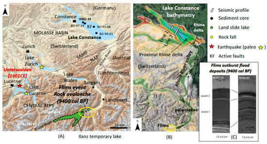On 18 September 1601 CE, Central Switzerland was hit by the Unterwalden earthquake, one of the largest historical earthquakes in Central Europe (Mw = 6.2). This event, located at the North Alpine front, triggered multiple subaquatic slides, rockfalls, and tsunami waves, resulting in well-documented seiche waves in Lake Lucerne [36,52,53,81,82]. The Rhine valley was also hit around 9400 Cal BP by the largest rockslide (ca.12 km3) in the Alps and in Europe: the Flims event. This evolved downslope into a rock avalanche deposit that formed a temporary dam across the Rhine valley (the Ilanz lake, Figure 5) and outstanding outburst Rhine River flood deposits in the deep basin of Lake Constance [10,46,83,84,85,86,87].