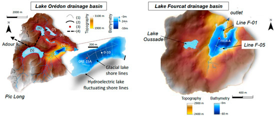 Lake Orédon (46 hectares (ha) and 1 km long) is one of the largest glacial lakes (together with Lake Cap de Long) in Pyrenees National Park in the Néouvielle massif. It drains into the Neste d’Aure River, a tributary of the Garonne River (Figure 3). Old topographic maps and pioneer studies from this region highlighted the occurrence of several glaciers in the upper catchment area, culminating at an altitude of 3194 m at the end of the Little Ice Age (LIA) [66]. Up to three high mountain streams draining two lakes and contrasted geological formations (granites and sedimentary rocks) build a delta in the SW part of Lake Orédon [69]. This lake was 35 m deep [70] before the construction of a dam in 1880 CE, which increased its depth to 59 m, when the first bathymetric map was produced [71]. Since then, the lake level has fluctuated (+/− 24 m) above a minimum altitude of 1832 m above sea level (asl) to produce hydroelectricity. Since the mid-19th century, the first temporary dams have been used to facilitate wood transport during summers from the lake shore to the town of St Lary located downstream of the Neste d’Aure River at 830 m asl [72]. Successive dams have been built downstream of Lake Cap de Long since 1909. In 1953, the largest hydroelectric reservoir in the northern Pyrenees completely flooded the lakes of Cap de Long and Loustallate, visible in Figure 3. A road was built upstream from Lake Orédon to reach Lake Cap de Long. Galleries were also drilled toward the west (into the Adour River drainage basin; Figure 2) to export water and produce hydroelectricity using a penstock [72]. In 1971, additional galleries were constructed to connect the Aumar and Aubert hydroelectric reservoirs (previously glacial lakes that drained into the NE part of Orédon) to increase the storage capacity of the Cap de Long reservoir [73]. Since this period, the Cap de Long hydroelectric infrastructure has been modulated according to water storage capacities and agriculture needs within the Garonne River watershed. However, globally, it has drastically reduced the water and sediment supply to the Orédon reservoir [74]. The first gravity cores retrieved from Lake Orédon were dated (by radionuclides and radiocarbon) and analyzed to document the evolution of atmospheric pollution since the Late Holocene [73].