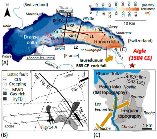 Compilation of available geophysical and coring data from Lake Geneva’s central basin. (A) Isopack map (in millisecond (ms) two-way travel time (twt) and meters)—modified from [96]—of lacustrine sediments illustrating Dranse and Rhone deltaic depocenters from multichannel air gun seismic surveys (light gray lines), locating Swiss and French littoral towns; former coring sites (J-34, J-35 Ku-I, Ku-II, Ku-IV, Ku-V, and KK8). Single-channel air gun seismic lines from 1969 (black thick lines L1, L2, and L3), together with 4 kHz chirp lines from September 2023 (red lines) and chirp lines (4 kHz and 10 kHz) from June 2023 (red dotted lines), are illustrated in this study. The epicenter of the Aigle earthquake and the impact zone of the Tauredunum rockfall in the Swiss Rhone valley are located. (B) Sparker seismic surveys from 1996 (black dotted lines) and 1998 (black lines) mapping Dranse delta sedimentary environments (from [75]), illustrating gas-rich deposits exposed to gravity and flooding hazards: channel–levee system (CLS); hyperpycnal flood deposit (HyFD); mass wasting deposit (MWD). The location of the sparker profile interpretation illustrated in Supplementary Figure S5 is indicated by a bold black line. (C) Irregular topography of Rhone valley related to Tauredunum rockfall deposits at the edge of the lake shore line, according to [77].