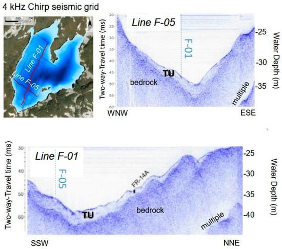 Lake Fourcat bathymetry, based on seismic data, is up to 36 m deep (applying a mean P wave velocity of 1.45 km/s in fresh water) in its western sub-basin (Figure 6 and Figure 8), but 60 m locally in the eastern basin [101]. The western basin is fed by a small tributary delta. On seismic profiles, the bedrock is clearly visible. It outcrops above ca. 21 m water depth (34 ms twt) along the western and eastern basin slopes (and at all the granitic shore lines) and towards the outlet. In front of the delta, a transparent unit (TU, Figure 8) is up to 4 ms twt thick and pinches out laterally along the steep bedrock slopes and toward the outlet. Assuming a mean Pw velocity of 1.5 km/s in lacustrine sediments, the TU is up to 3 m thick. At the FR-14A coring site, the TU is, however, only 2 ms twt thick (i.e., around 1.5 m).