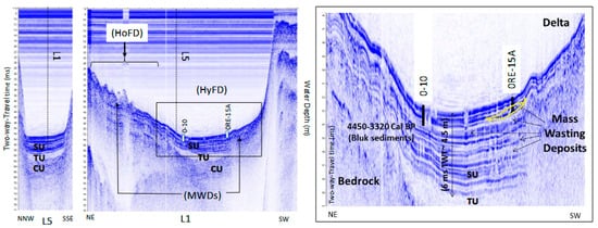 The association of sedimentary facies of the lower unit and the identification of chaotic acoustic facies near the lake floor at the sub-surface of the ORE-15A coring site are the typical signatures of mass-wasting deposits in lakes [19,33,36,41]. The age of 950 +/− 53 cal CE at 45 cm core depth in ORE-15 suggests that a historical mass-wasting event reworked sediments that had initially accumulated at the delta slope during the last millennium.