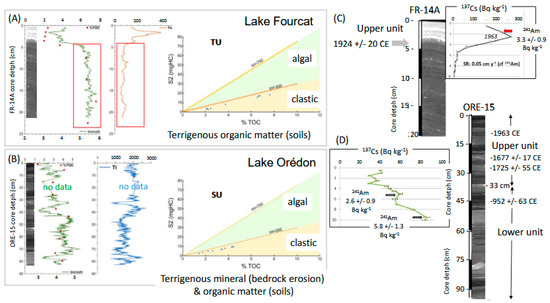 Recent sediments in Lake Fourcat highlight two contrasting sedimentary facies in core FR-14A (Figure 10). The upper facies (0–4.5 cm depth) is characterized by laminated dense sediments in X-ray images and by high values of Fe and a low inc/coh ratio in XRF data. Based on Rock-Eval measurements, this upper unit contains ca. 2% of total organic carbon (TOC). The lower unit (4.5 to 21.5 cm depth) is also laminated in X-ray images, but is less dense, contrasting with frequent small drop stones, locally developing several horizons (ca. 7 cm, 13 cm, and 20 cm core depth). This unit consists of organic-rich sediments (6 to 7% TOC), a higher inc/coh ratio, and a lower XRF intensity of Fe. Rock-Eval pyrolysis results represented by an S2 (mgHC/g, S2 = HI × TOC) versus TOC (%) diagram fall within the same area below the line (IH = 300 mgHC·g−1·TOC). This characterizes the terrigenous organic matter typical of soils [6,7,14]. The maximum content of 137Cs was identified within the upper unit between 2 and 3 cm core depth (Supplementary Table S2), together with traces of 241Am detected between 1 and 2 cm core depth (Figure 10). These radionuclides can be associated with the nuclear weapon tests culminating in 1963 CE in the Northern Hemisphere [6,7,14]. A mean sedimentation rate of 0.05 cm/yr can therefore be estimated for the upper unit and allows dating the transition to the lower unit to 1924 +/− 20 CE (considering that 1 cm of sediment sample corresponds to 20 years of sedimentation). Assuming that Lake Fourcat was formed around 8.4 kyrs and that the P wave velocity of the lower unit is ca. 1.5 km/s, it is likely that the 145 cm thick sedimentary sequence visible in seismic data accumulated with a mean sedimentation rate of 0.017 cm/yr.