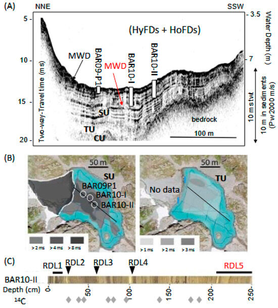 Alpine Lake Blanc was similarly mapped with the portable Inomar parametric sub-bottom profiler. The transducer was used with an 8 kHz chirp signal, connected to an acquisition unit, a GPS, and a laptop computer, as shown in Figure 1. These data were interpreted and used to optimize the coordinates of a coring site. An UWITEC gravity corer and a piston corer (both 63 mm diameter) were used from the frozen surface of the lake during the winter of 2009–2010. One gravity core (BAR09P1) and two piston cores (BAR10-I and BAR10-II) were collected. A 250 cm long synthetic log was built for core BAR10-II based on sedimentary facies together with laser grain size, GEOTEK core logger measurements (magnetic susceptibility, gamma density, P waves velocity, video capture, and spectrophotometry), and Avaatech XRF core scanning, as detailed in [13]. Up to nine AMS radiocarbon ages from macro-remains were obtained at the LMC14 laboratory (Saclay, France), together with 137Cs underground measurements at the LGGE (Grenoble, France), in order to establish BAR10-II chronology. In addition, sedimentological and seismic data were used to identify rapidly deposited layers (RDLs) and to establish a composite sediment age–depth model. This chronology allows for correlating four different RDLs with local and regional historical events (see below).