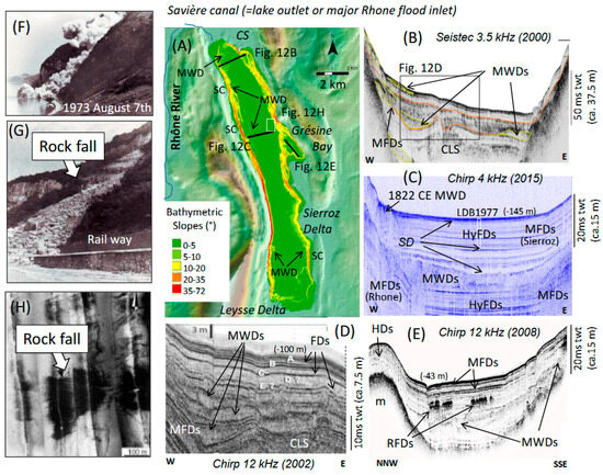 Geomorphology and stratigraphy of Lake Bourget shore lines and sedimentary infill. (A) Topographic maps and bathymetry slope maps of Lake Bourget locating selected seismic profiles shown in (B–E) (black lines) and side scan sonar mosaic illustrating the 1973 rockfall deposit on the lake floor (white rectangle). (F) Picture of the ongoing Casquette rock fall event. (G) Picture of the Casquette Rock fall deposit on land. (H). Side scan sonar mosaic of the lake floor illustrating the Casquette rock fall deposit underwater. CS: Chautagne swamp. SC: slide scar. MWD: mass-wasting deposit. CLS: channel–levee system. HyFDs: hyperpycnal flood deposits. MFDs: mesopycnal flood deposits. SD: seiche deposit. FDs: flood deposits. HDs: hemipelagic deposits. m: moraine.