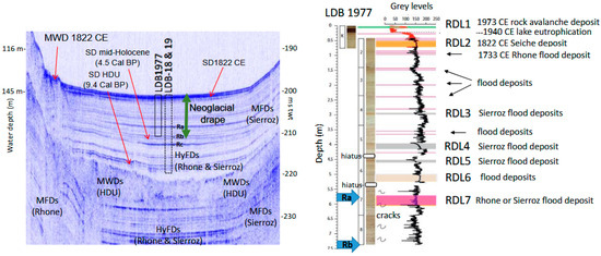 Figure 13 illustrates the correlation between the 4 kHz chirp acoustic facies and the sedimentary facies identified in the LDB1977 composite sequence, combining digitalized optical pictures and measurements in grayscale. The chronology of LDB1977 is provided in the upper meter of the sequence by the identification of the 1973 CE rock avalanche deposit (RDL1), the onset of biochemical varves in 1942 CE, the 1822 CE earthquake-induced seiche deposit (RDL2), and the 1733 CE historical Rhone River flood deposit. At 3 m below the 1977 lake floor, there is a succession of two usual red-colored deposits (1 cm and 5 cm thick) that matches a level where chirp data illustrate a relatively high-amplitude reflection within the Holocene drape. This reflection occurs in the axis of the central basin (i.e., hyperpycnal flood deposits) and extends along the eastern slopes of the basin (i.e., Sierroz River mesopycnal flood deposits). The two layers have a similar red color, suggesting that they are composed of clastic sediments originating from the same source area in the drainage basin of the Sierroz River. The first layer is thinner, with gradual basal and upper boundaries, while the second, thicker layer has a sharp base with a gradual upper boundary. These are, in Lake Bourget, the typical sedimentary signatures of distal mesopycnal and hyperpycnal flood deposits [10,31,75]. These two flood deposits may thus constitute a new chronostratigraphic marker (RDL3) for Lake Bourget. Similarly, both RDL4 (a 20 cm thick sharp-based reddish deposit with a gradual upper boundary occurring between 400 and 420 cm) and RDL5 (identified between 450 and 460 cm core depth) in LDB1977 are likely Sierroz River hyperpycnal flood deposits (Figure 13). RDL6, a similar but grayish hyperpycnal flood deposit, is identified between 500 and 523 cm in LDB1997. Finally, RDL7, occurring between 565 and 600 cm in LDB1977, is the thickest grayish hyperpycnal flood deposit identified. This layer corresponds to a high-amplitude reflection (Ra) in the basin axis and could thus result from either the Rhone or the Sierroz River.