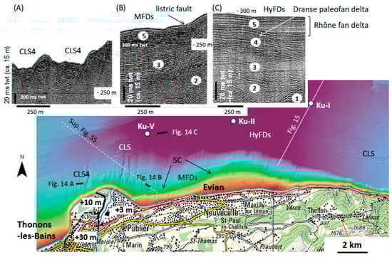 Slide scars are also identified in the bathymetric data (around 200 m water depth) offshore from the city of Evian (Figure 14). In addition, late Holocene mass-wasting deposits at the foot of the southern slopes, originating from this part of the basin, were documented in the 3.5 kHz pinger data [103]. These mass-wasting deposits originating from the Dranse River mesopycnal flood deposits were coeval with a major mass-wasting event off the coast of Lausanne. This event was dated at the base of core Ku-IV (Figure 7) and possibly explained by an earthquake–mass movement–tsunami event during the Early Bronze Age [103]. The base of this catastrophic Bronze Age event is identified in the pinger data at 460 ms twt in the deep central basin of Lake Geneva.