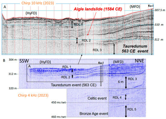 Lake Geneva central basin seismic profiles and event stratigraphy based on high-resolution Chirp data collected in 2023 across the Rhone fan delta. (A) Echoes 10,000 compact profile. (B) Knudsen 4 kHz Pinger profile. These two complementary profiles were obtained at identical locations and calibrated using data from the piston core Ku-I, as illustrated in Figure 14. Up to five rapidly deposited layers (RDLs) are identified and correlated with former sediment cores and 3.5 kHz data in the area, according to [80,94,102]. Contrasting acoustic facies characterize Rhone River hyperpycnal flood deposits (HyFDs) and mesopycnal flood deposits (MFDs). The correlation of the upper part of the Bronze Age event (RDL5) and the Tauredunum event (RDL3) allows us to better understand the impact of the Aigle earthquake in 1584 CE (RDL2) and to discuss the triggering of a poorly documented Celtic event (RDL4), as discussed in the text.