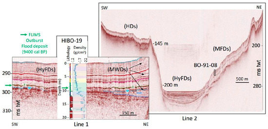 These data illustrate how the Flims outburst flood deposit developed on Line 1, a continuous high-amplitude reflection ca. 9.5 m below the lake floor in the deep and flat central basin. This horizon contrasts with the Early Holocene sediments, which have a transparent acoustic facies, and the Mid to Late Holocene deposits with lower-amplitude continuous and high-frequency reflections sampled by core HIBO-19. Below 11 m core depth, coarser and denser Late Glacial sediments prevent the penetration of the acoustic signal. Locally, three generations of Holocene mass-wasting deposits originating from the NE slopes of the basin produce small lens-shaped bodies with chaotic to transparent acoustic facies thinning toward the basin axis (ca. 10 m; 5 m and 2 m below the lake floor). A sandy turbidite sampled at around a 10 m core depth in HIBO-19 is dated to around 11 kyrs [85] and is associated with a prominent high-amplitude reflection (reflector M in Figure 16) that laterally matches the southwestern edge of the older mass-wasting deposit.