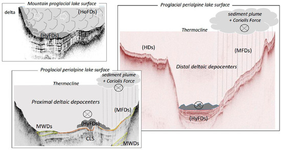 Large glacial lakes formed at the piedmont of both the Northern Pyrenees and the Western and the Northern Alps (Figure 2, Figure 3, Figure 4 and Figure 5) following the Last Glacial Maximum [23,28,55,56,57,59,60,63,75,76,84,85]. During the Late Glacial period, climate changes favored glacier melting and their retreat upstream from most large European glacial valleys. A large sediment supply from numerous braided fluvio-glacial streams caused large volumes of clastic sediments to accumulate in European piedmont and perialpine lakes. Large subaquatic deltaic depocenters formed in these lakes during this period through the accumulation of hyperpycnal flood deposits in their deep glacial basins (Figure 1 and Figure 17) [56,57,75].
