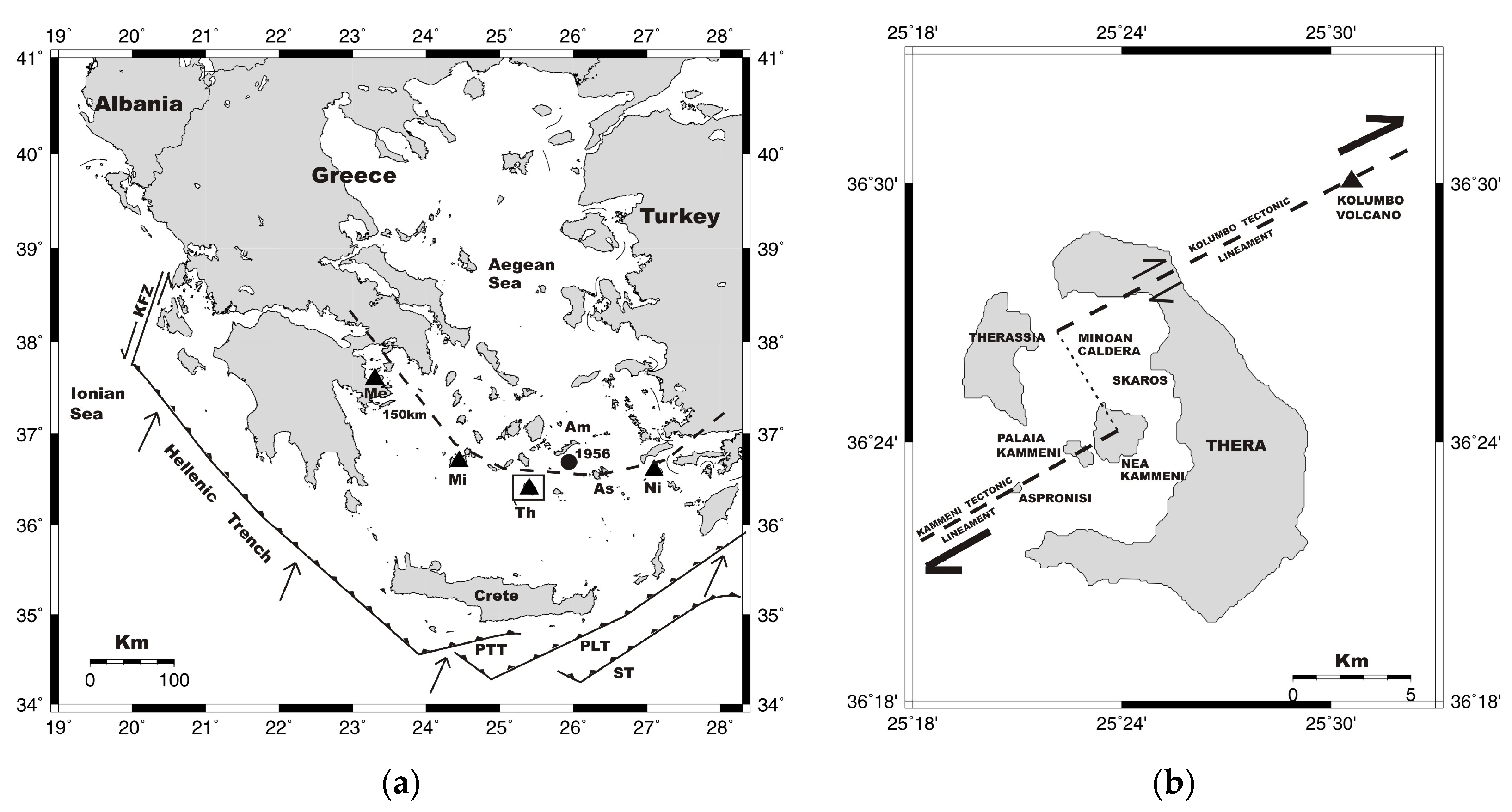 - Georgalas, G.C. Catalogue of the Active Volcanoes of the World Including Solfatara Fields; Part XII-Greece; International Volcanological Association: Rome, Italy, 1962; pp. 1–40. [Google Scholar]