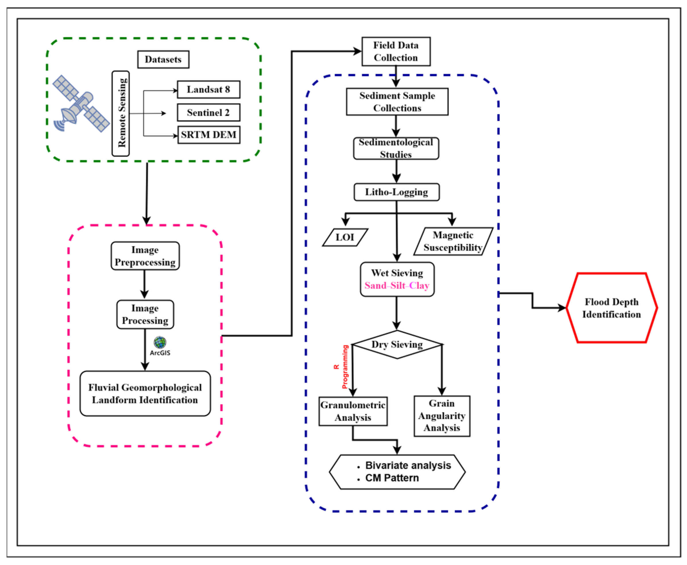 - Magalingam, S.; Radhakrishnan, S.; Karuppannan, S.; Alam, E.; Islam, M.K. Demarcating paleoflood repositories using documentary evidence and flood geomorphic landforms. Quat. Sci. Adv. 2025, 18, 100281. [Google Scholar] [CrossRef]