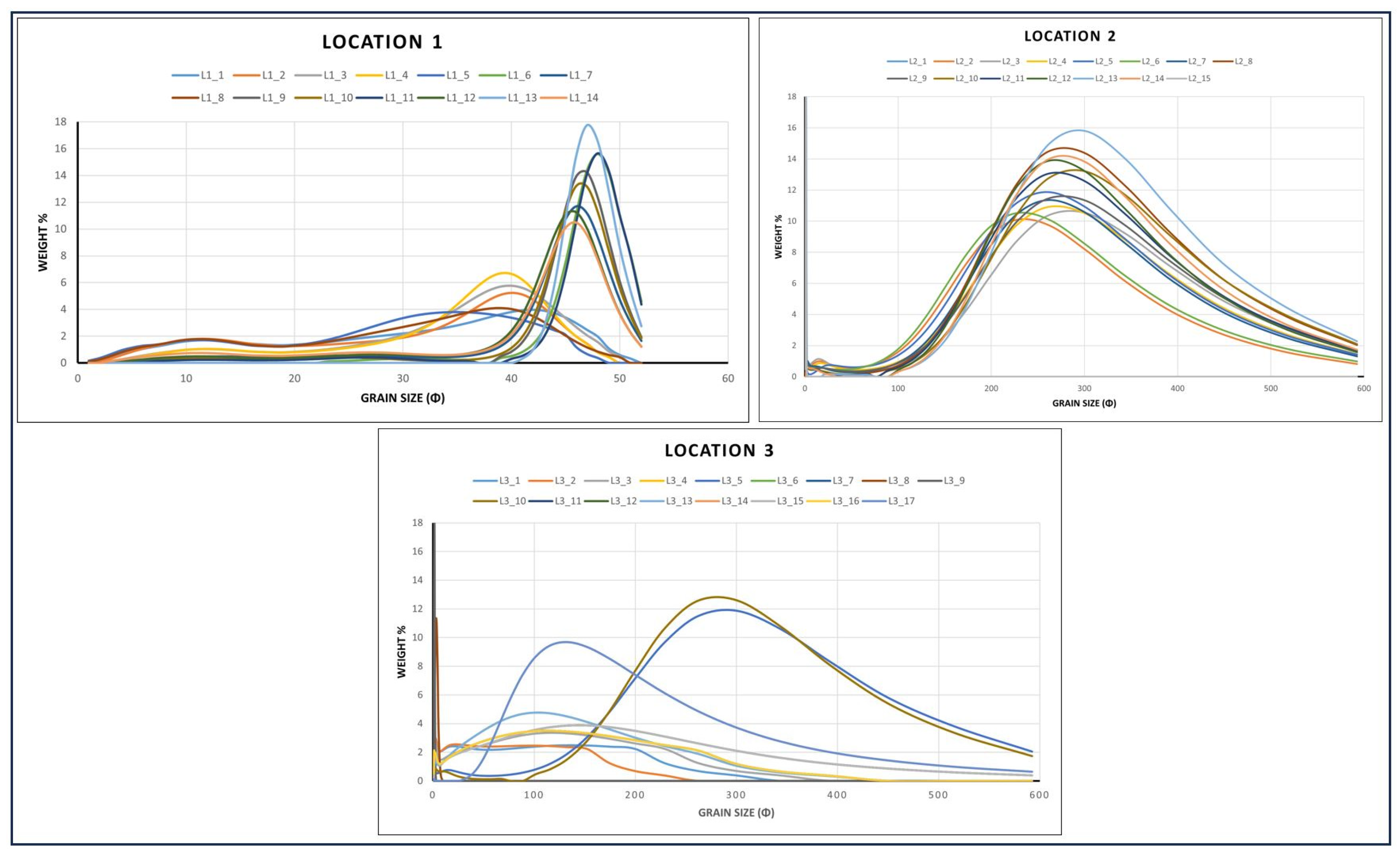 | 3 | 15 | Trimodal | 5.720 | 2.672 | 0.162 | 0.654 | Coarse Silt | Very Poorly Sorted | Fine-Skewed | Very Platykurtic |
