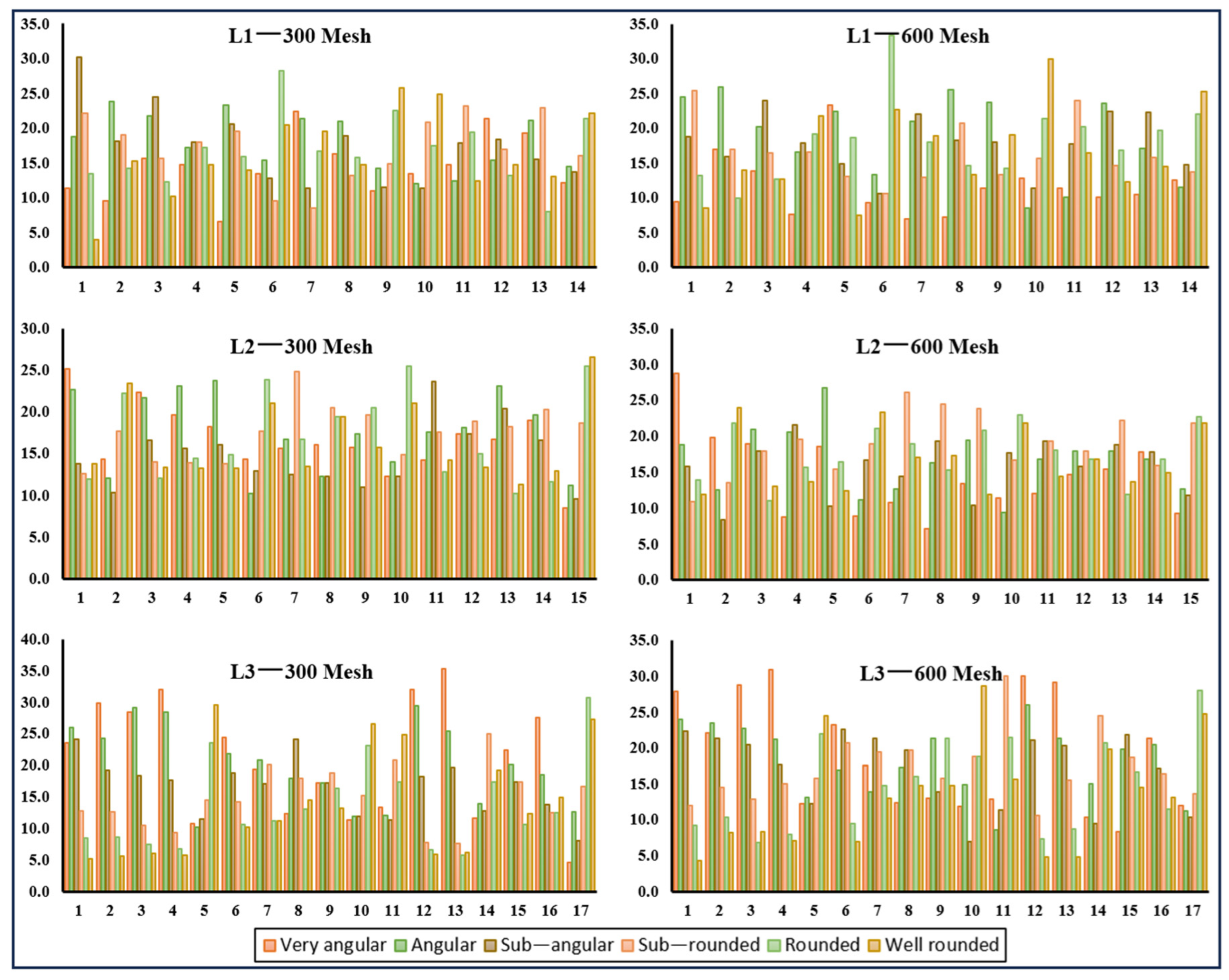 | 1 | 18 | Trimodal | 6.090 | 2.542 | −0.020 | 0.717 | Medium Silt | Very Poorly Sorted | Symmetrical | Platykurtic |