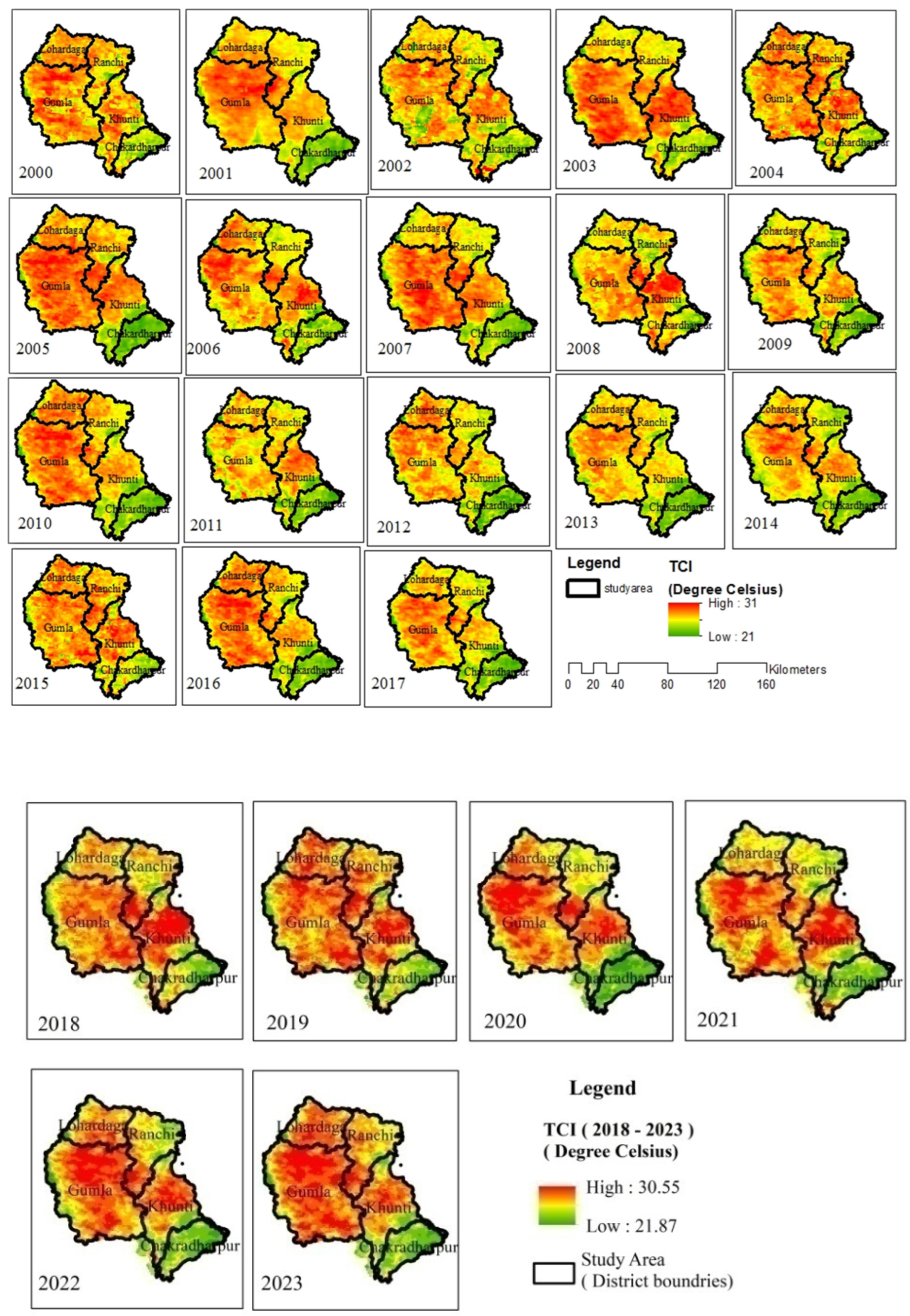 - Tirkey, A.S.; Ghosh, M.; Pandey, A.C.; Shekhar, S. Assessment of climate extremes and its long term spatial variability over the Jharkhand state of India. Egypt. J. Remote Sens. Space Sci. 2018, 21, 49–63. [Google Scholar] [CrossRef]