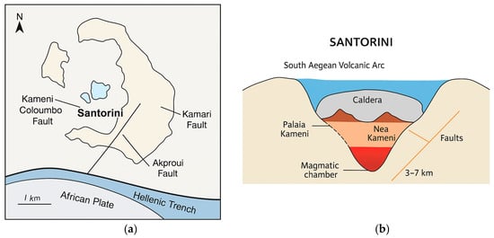 Santorini is in the central sector of the North Aegean Tectonic Arc (NAHT), which developed as a result of the subduction of the African lithospheric plate beneath the Eurasian plate along the Hellenic Trench. The continuous subduction at a rate of approximately 3–4 cm/year causes intense intermediate-depth seismicity, as well as the occurrence of magmatic systems along the arc. Santorini is the most active volcanic center in the central section, which hosts a magma chamber at depths of 3 < D < 7 km responsible for historical eruptions (e.g., Minoan Crete) beneath the caldera [6,7].