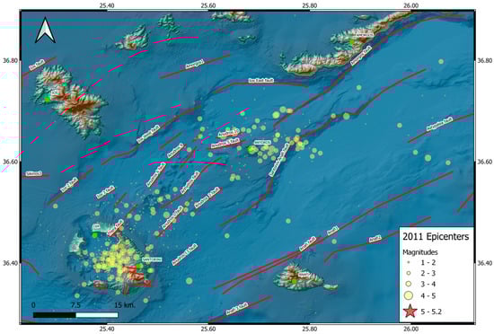 Seismic activity and fault distribution in the Santorini–Amorgos–Anafi region for the year 2011. Epicenters are represented by circles scaled to earthquake magnitude, while red lines indicate mapped faults for the study area [15]. The map highlights the correlation between seismicity and the main fault systems surrounding the Santorini volcanic complex and adjacent islands. Green squares denote the largest cities near the epicenter.