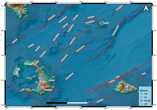 Station distribution for the HUSN for the studied region, Santorini–Amorgos–Anafi. Red lines correspond to the main active faults for the study area [32]. Copernicus Land Monitoring Service used for DEM [15]. Blue triangles represent the seismological stations belonging to the National Kapodistrian of Athens Seismological Network [33], red triangles represent the seismological stations belonging to the National Observatory of Athens—Institute of Geodynamics [34], purple triangles correspond the common seismological stations of National Observatory of Athens (Institute of Geodynamics and Geofon) and finally yellow triangles correspond to the seismological stations belonging to the AUTH Seismological Network [35]. Green squares denote the largest cities in the study area.