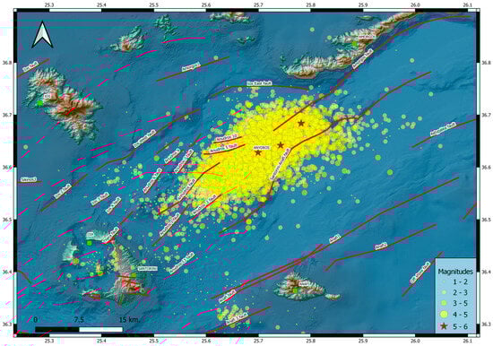 Spatial distribution of earthquake epicenters in the Santorini–Amorgos region. The map shows seismic activity recorded during the analyzed period, with epicenters color-coded and scaled according to magnitude. Red lines represent major active faults [32]. The concentration of seismicity between Amorgos and Santorini indicates intense fault activity along the Santorini–Amorgos fault zone, including events up to magnitude ML = 6.0 (red stars). The strongest events (are marked with red stars) are concentrated mainly along the Santorini–Anydros fault, reflecting the close interaction between tectonic stress and volcanic activity. The region is part of the Greek arc, where the subduction of the African plate under the Eurasian plate controls the evolution of both seismicity and magmatic activity.