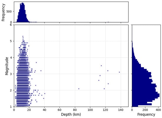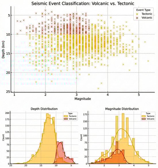 From a seismological point of view, the two types of earthquakes show clear differences in their morphological and spectral characteristics. Tectonic earthquakes are characterized by high-frequency seismic waves and short duration, with a clearly defined rupture point [40]. Volcanic earthquakes, on the other hand, exhibit prolonged low-frequency waves (long-period events), which are attributed to fluid flow and the complex geometry of their sources. In addition, volcanic earthquakes occur at shallower depths (usually <10 km), while tectonic earthquakes can reach depths of up to 20–30 km, representing deeper structures of the lithosphere [48].