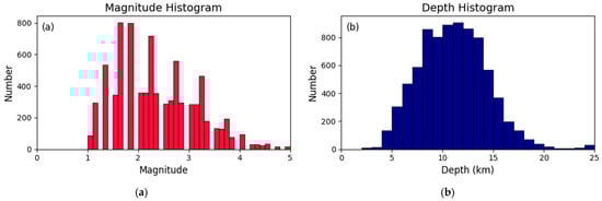 Histograms of magnitude (a) and depth (b) of seismic events in the Santorini area. Most earthquakes have a magnitude 1.0 < ML < 3.0 and a depth of 8.0 < D < 15.0 km, reflecting the action of shallow faults and possible magmatic mobility in the upper part of the crust. These distributions support the conclusions of the statistical analysis regarding the dominant shallow seismicity and its connection to the Santorini volcanic system.