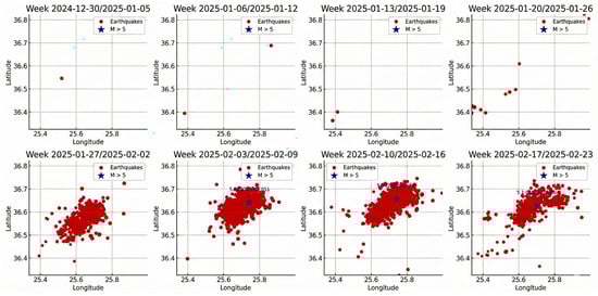 Spatial and temporal distribution of seismic activity in the sea area between Santorini and Amorgos from late December 2024 to late February 2025. Each graph corresponds to one week of recordings. The red dots represent the epicenters of earthquakes, while the blue stars indicate events with a magnitude of M ≥ 5. The gradual concentration and subsequent dispersion of seismicity during the main phase of seismic excitation can be seen. The figure corresponds to material previously posted on the author’s personal LinkedIn profile [50] (February 2025).