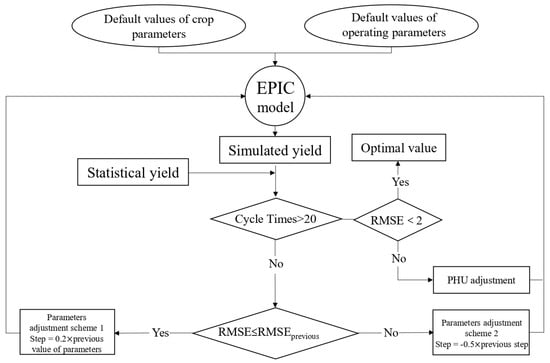 EPIC is a comprehensive model to simulate the growth process of crops under certain environmental conditions, including temperature, soil, hydrology, fertilization, and other modules, which can simulate the yield of crops per unit area for a year and output the water stress of rice during its growth period in a daily step. In this study, EPIC0509 was used to simulate the growth process of rice in MRACs. In view of previous studies [25,30,31], four key crop parameters including biomass energy ratio (WA), harvest index (HI), maximum potential leaf area index (DLMA), and leaf area decline rate (DLAI) in the growing season, as well as potential thermal unit (PHU), the key parameter of output operation files, were used to correct the EPIC model. The optimal parameters of the EPIC model were determined according to the flow chart in Figure 3. The four crop parameters were adjusted preferentially. If the RMSE result was greater than 2, PHU was further adjusted and the four crop parameters were further adjusted until the RMSE was less than 2 or reduced to the minimum.