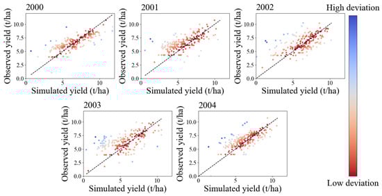Figure 4. Scatter plot of simulated and observed yields. The scatter plot shows the relationship between EPIC’s simulated and actual yields. The dashed line in the figure represents the 1:1 line. The points converge around the 1:1 line.