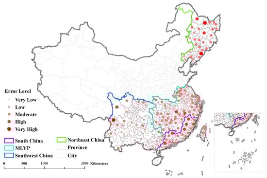 Figure 5. Spatial distribution of the mean absolute error (MAE) between simulated and observed yields. The map illustrates the MAE of EPIC-simulated yields compared with actual observations across all cities.