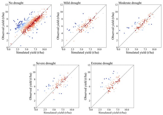Figure 6. Scatter plots showing the relationship between simulated and actual yields under different drought levels. The dashed line in the figure represents the 1:1 line. The points converge around the 1:1 line.
