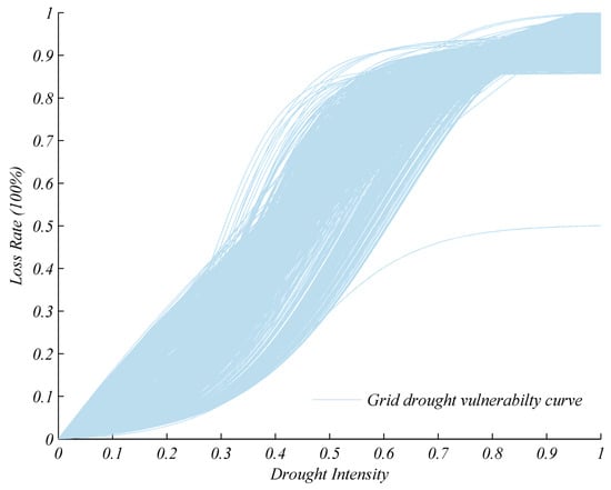 By fitting the rice vulnerability curve of each basic assessment unit (0.5° grid), the relationship between rice yield loss and drought intensity in China was obtained, as shown in Figure 9. A vulnerability curve near the Y-axis is more sensitive to drought. A curve closer to the X-axis means lower drought vulnerability. In most areas, the yield loss rate increased rapidly when the drought intensity value reached 0.3–0.75. When the drought intensity was between 0.4 and 0.45, the vulnerability curve changed the most. When the drought intensity reached 0.75, the increase in yield loss rate decreased.