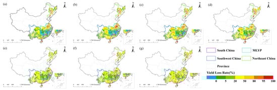 As shown in Figure 11, the rate of rice yield loss in China is generally high in the north and low in the south in the past period. The rate is high in the central part of northeast China and the Yangtze River Basin, the rate is second highest in the south of Nanling, the rate is lower in the southwest border area of northeast China and the central area of south China, and the rate is lower in the central area of south China.