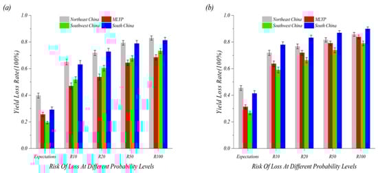 On the whole, the risk under the RCP4.5 scenario was lower than that under the RCP8.5 scenario. Northeast China and south China were more exposed to drought risk, and the expected rice drought risk loss rate was higher. The expected yield loss rate in northeast China was the highest among the four regions, with a projected yield loss rate of 39.75% and 45.5% under RCP4.5 and RCP8.5, respectively. However, under the RCP8.5 scenario, south China will face more than an 80% drought risk loss rate in different return periods. It is worth noting that under RCP4.5, the risk of drought recurrence in northeast China is greater than that in south China, while under RCP8.5, it is greater in south China, and the same situation also occurs between MLYP and southwest China.