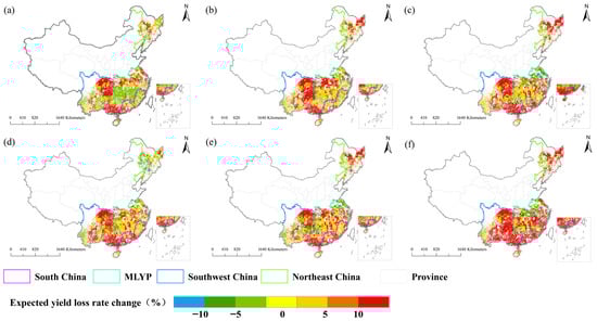 Figure 14. Rice expected yield loss rate change in the future. (a) Short-term future (2031–2050) in RCP4.5 scenario relative to baseline, (b) medium-term future (2051–2070) in RCP4.5 scenario relative to baseline, (c) long-term future (2071–2090) in RCP4.5 scenario relative to baseline, (d) short-term future (2031–2050) in RCP8.5 scenario relative to baseline, (e) medium-term future (2051–2070) in RCP8.5 scenario relative to baseline, (f) long-term future (2071–2090) in RCP8.5 scenario relative to baseline. Regions in red indicate increased risk and regions in green indicate risk decreases in the future.