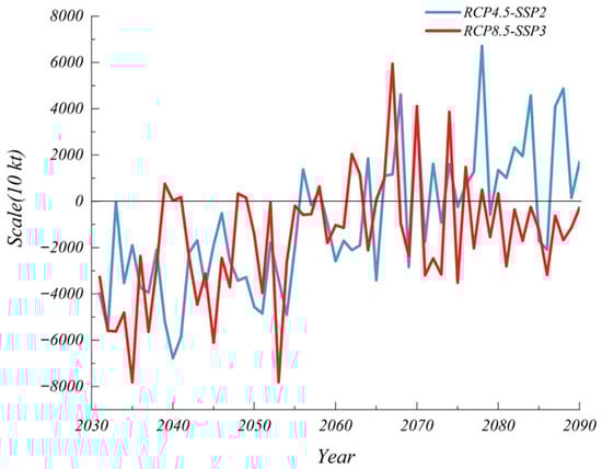 In the context of future climate instability, an increased risk of food loss due to climate change may lead to supply–demand conflict. As the main food crop, rice plays an important role in maintaining national food security. According to the per capita consumption of rice in China in 2019 and the forecast of the future population growth in China after the full liberalization of family planning under the SSP2 and SSP3 scenarios [58], the supply–demand relationship of rice in China under drought risk in the future period (2030–2090) under the RCP4.5-SSP2 scenario and the RCP8.5-SSP3 scenario was calculated (Figure 15). On the whole, China will face the problem of intensified contradiction between the supply and demand of rice caused by drought risk in the future, especially in the near future. The period from 2030 to 2055 will be a period of a severe rice gap in China. The maximum grain gap under the RCP4.5-SSP2 and RCP8.5-SSP3 scenarios is expected to reach 67,770 kT and 78,110 kT, respectively, and there will be two peak values of the gap under the RCP8.5-SSP3 scenario around 2035 and 2053. This shows that China needs to adjust its food security strategy in a timely manner and increase drought-resistant irrigation facilities and grain reserves. After 2055, the crisis of rice supply and demand under drought risk in China is greatly reduced compared with the near future, but it still has great volatility.