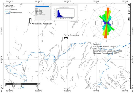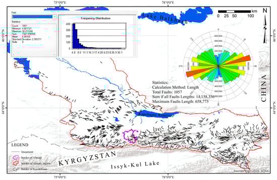 For the regional analysis, the Almaty Region was selected, with a total area of 206,228 km2 (Figure 3). As a result of automatic and subsequent manual extraction, 1057 lineaments of varying lengths were identified. The length of the detected linear structures ranges from 4800 to 30,000 m, indicating the presence of both local and regional tectonic dislocations. Spatial analysis revealed that the lineaments are distributed unevenly, forming clusters associated with tectonically active zones. The constructed rose diagram of azimuthal distribution demonstrates a predominant southwest–northeast orientation, which correlates well with regional structural trends. This dominant orientation may indicate the presence of active deep-seated faults and potentially unstable zones.
