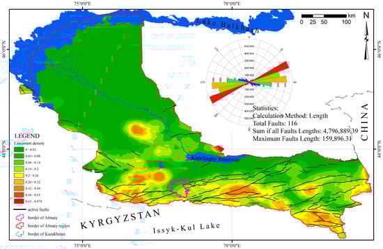 Lineament density map of the Almaty Region, showing major regional faults and rose diagram of fault orientations.