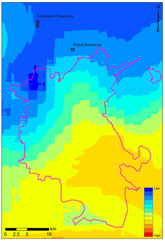 The results of the density analysis showed that, overall, the map is characterized by a low density of linear structures, with the exception of several local zones within the urbanized area where increased density is observed (Figure 6). In contrast, in the areas of the Voroshilov and Priyut reservoirs, the lineament density is relatively low.