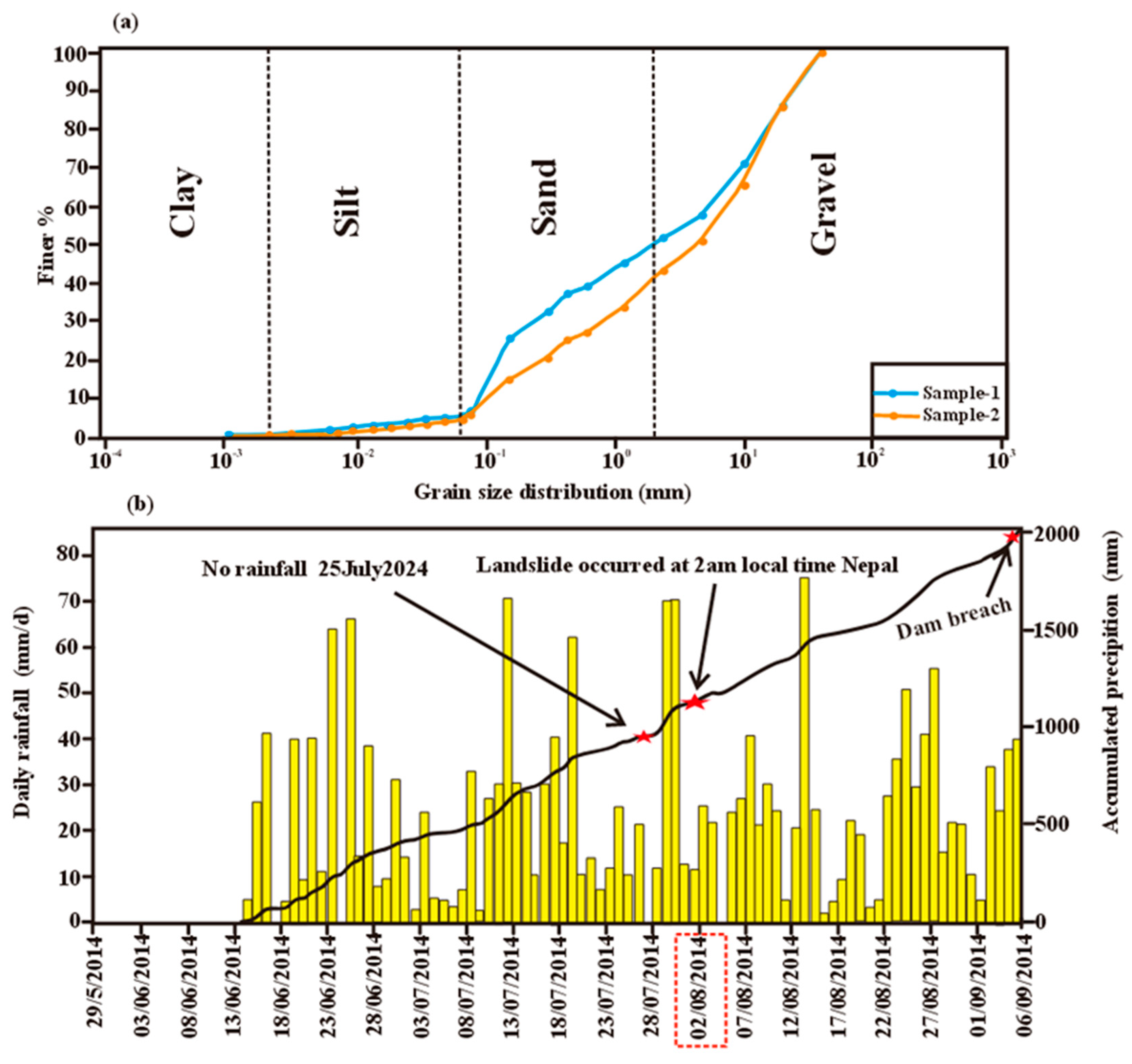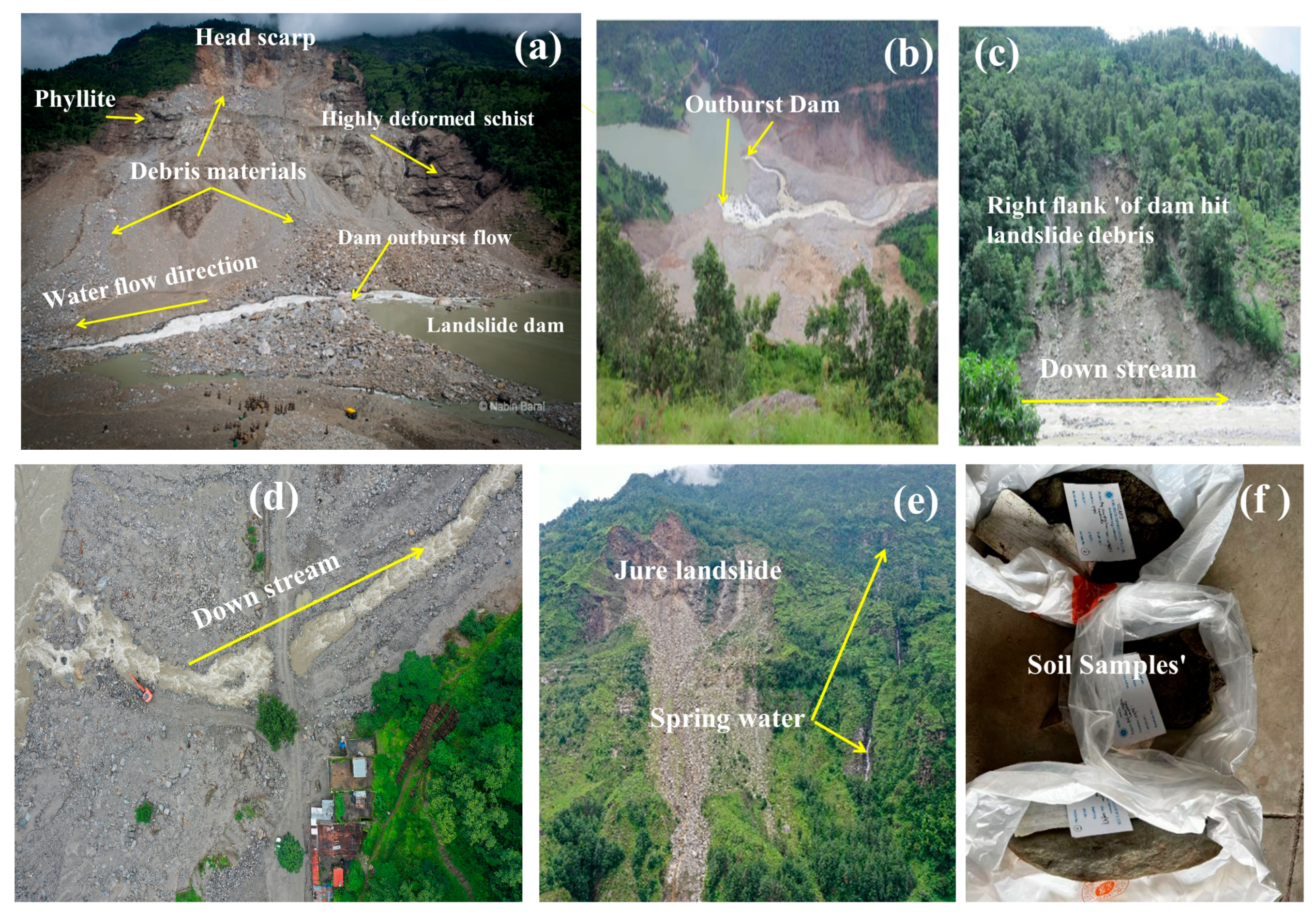 - Pokharel, J.; Regmi, S.; Bhattarai, D.; Devkota, L.; Adhikari, T.; Rajauria, A.; Subedi, M.; Dawadi, P. A Report on Study of Sunkoshi Landslide Dam in Jure, Sindhupalchowk; The Nepal Engineers’ Association (NEA): Lalitpur, Nepal, 2014; Volume 18. [Google Scholar]