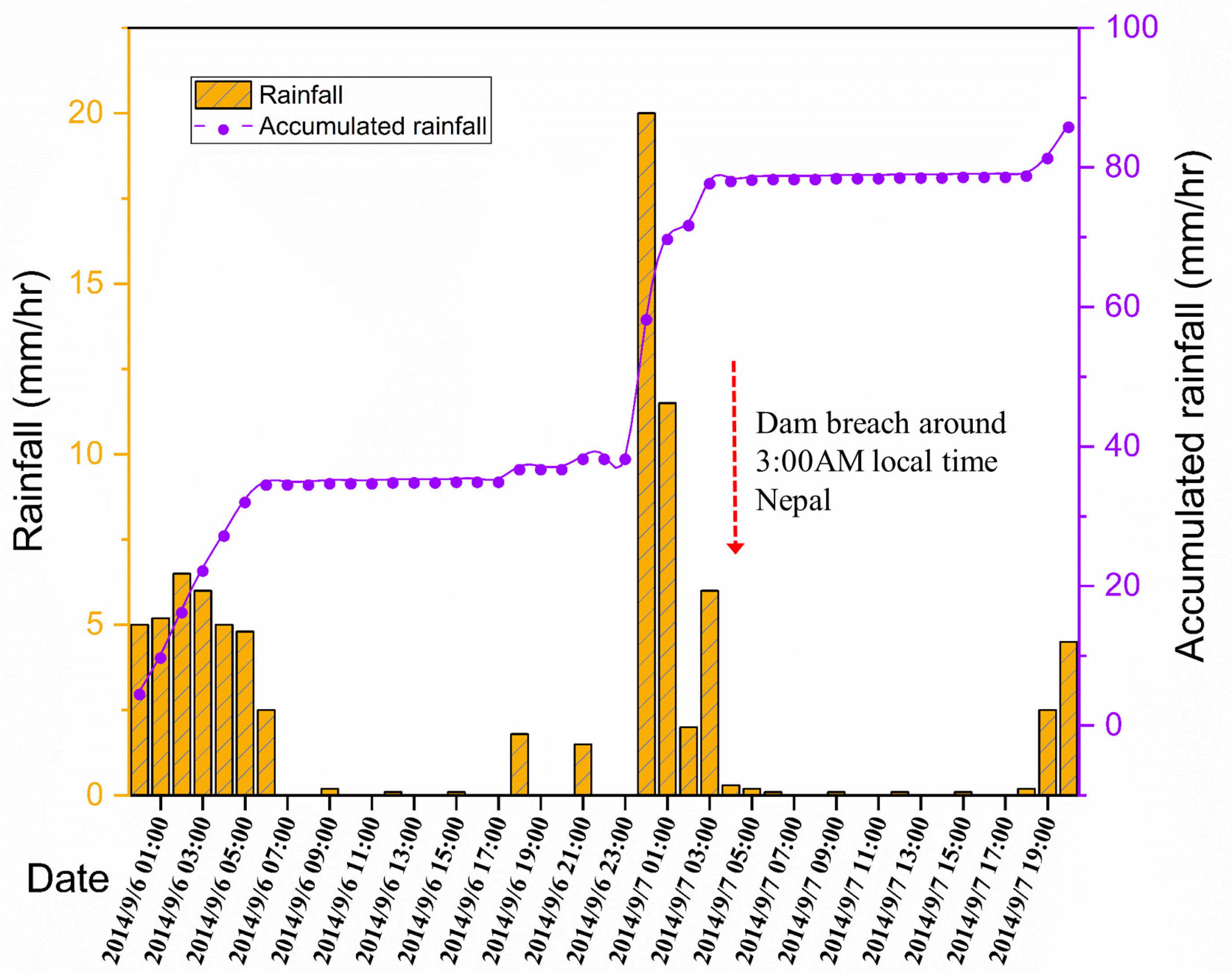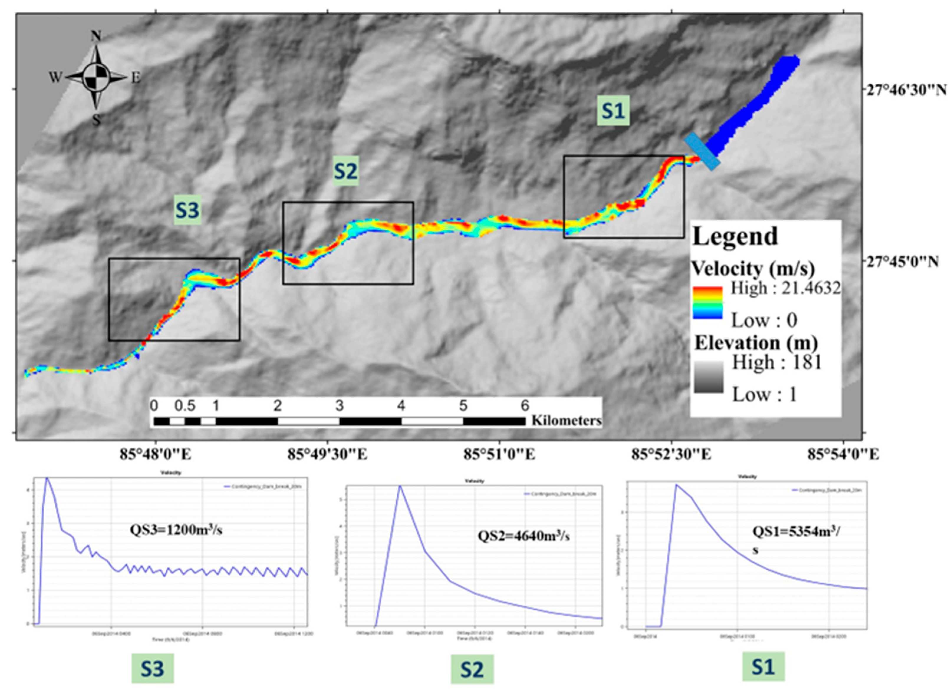 | Dam Height (m) | Dame Breach Formation Time | Peak Discharge (m3/s) | Depth (m) | Velocity (m/s) |